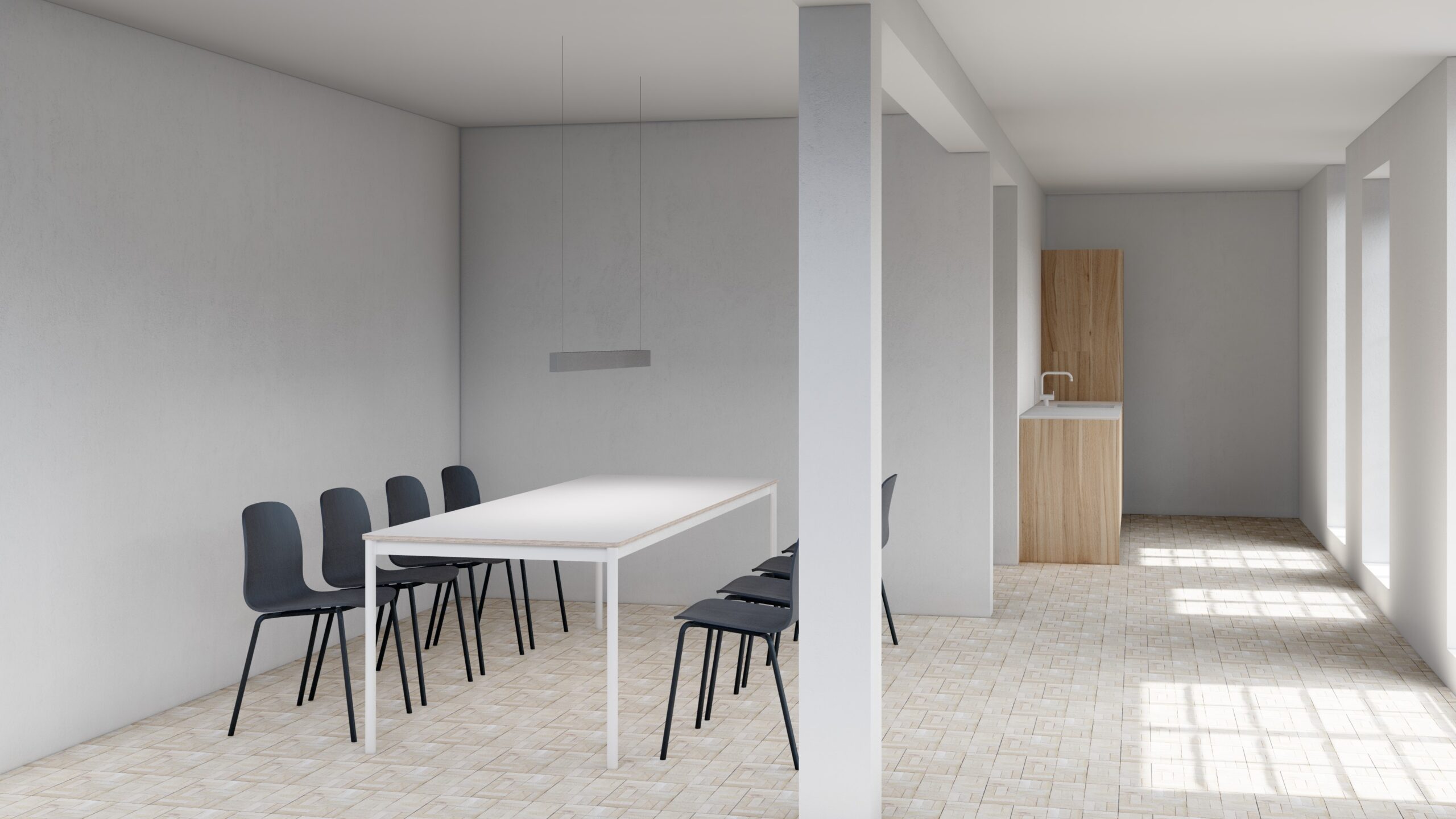 I kælderetagen finder man køkkenet og lounge, hvor man også kan åbne de store døre og få frisk luft. Specielt ved dette område er muligheden for at få et pusterum. Hvis man stadig har energien, kan man socialisere sig med hinanden efter egen behov og udveksle kreative ideer. Derfor er området også det perfekte sted for at kunne skabe den innovative idéudvikling.